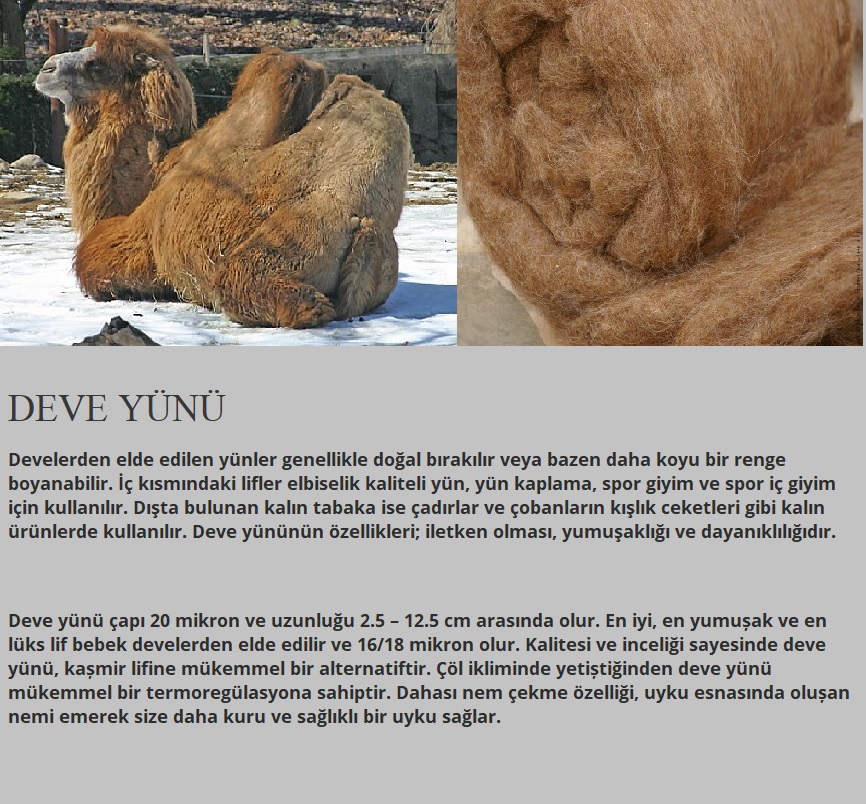 Deve yünü, genellikle Doğu Avrupa ve Asya'da bulunan iki hörgüçlü Bactrian Camel'den elde edilir, lüks yumuşak deve yünü lifi, sıcak yaz aylarında devenin yumuşak karnından toplanır. Doğal olarak, develeri vahşi bir ortamda aşırı sıcak ve soğuktan korumak için tasarlanmış bir malzeme olan deve yünü, olağanüstü yalıtım özellikleri sunar, yumuşaktır ve her koşulda cilt için çok rahattır. Oldukça yakın zamana kadar, bu lifler neredeyse yalnızca palto ve eşarp gibi üst düzey giysi imalatında kullanılmıştır. Güzel giysiler için harika özellikler, bunu herhangi bir birinci sınıf mobilya yapımına ideal bir ek yapar.